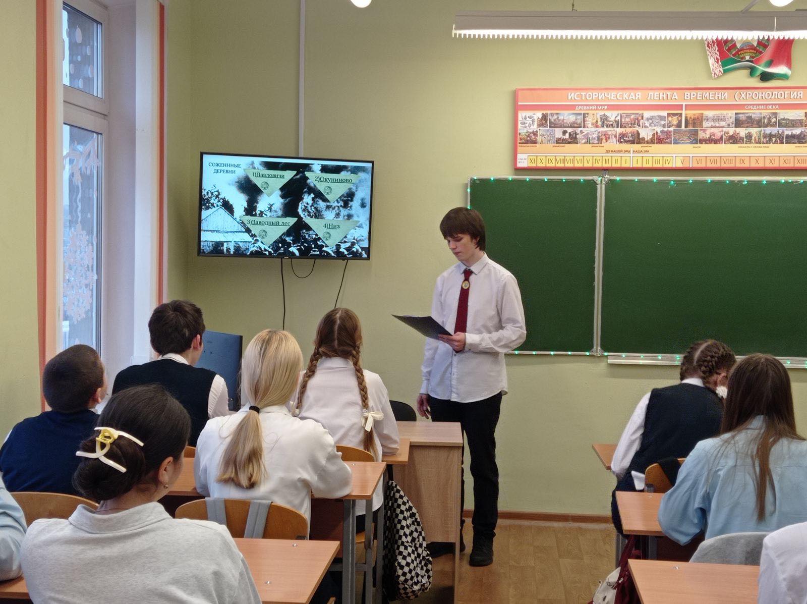 4 декабря состоялась презентация проекта "Без права на жизнь: слонимские Хатыни". Учащийся 11 класса Рожко Даниил презентовал учащимся 8 класса электронный плакат "Без права на жизнь: слонимские Хатыни".Слонимские деревни Низ , Павловичи, Заводный лес, Окуниново разделили трагическую судьбу Хатыни.